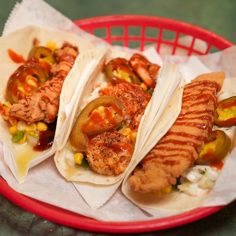 1 pc fried chicken tender | Served on a flour tortilla with BBQ sauce, corn pico, jalapeno, and topped with sriracha sauce.